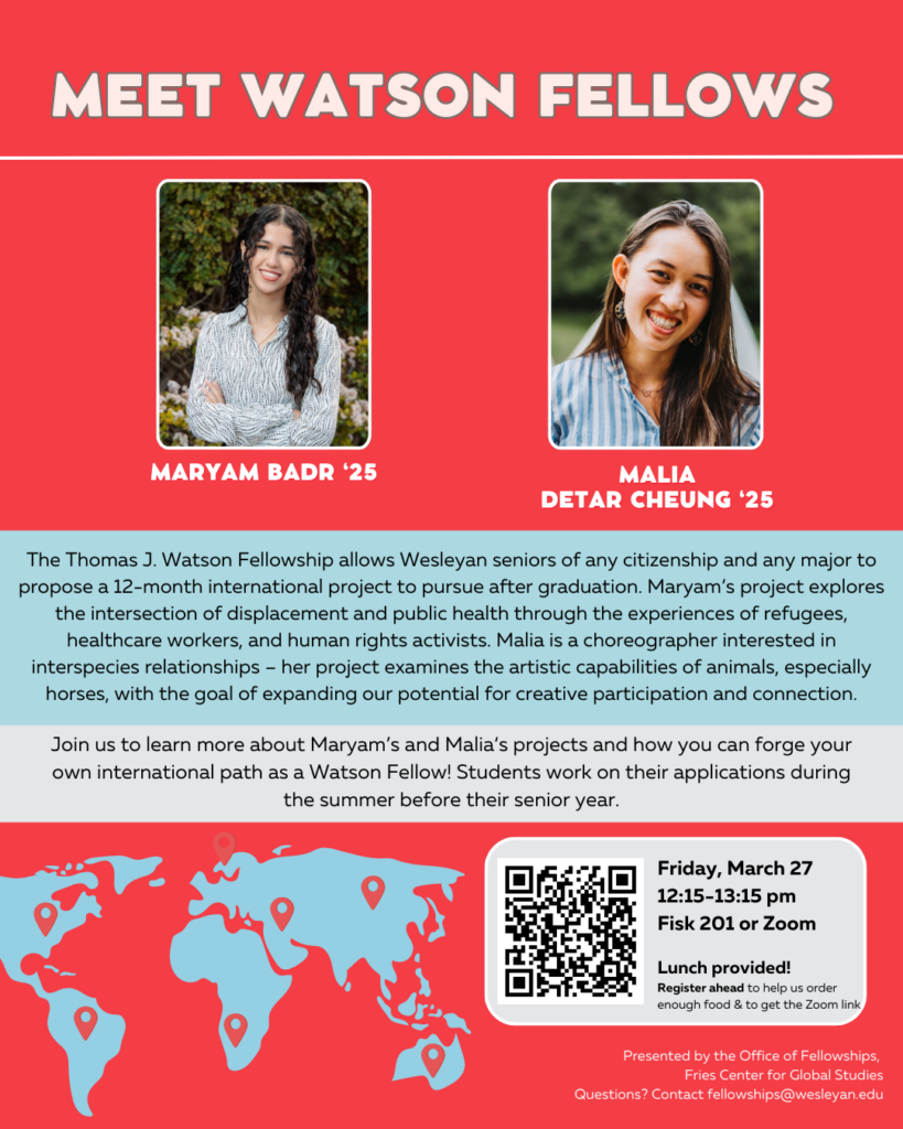 Friday, March 27 at 12:15 pm in Fisk 201 or on Zoom: a conversation with current Wesleyan Watson Fellows Maryam Badr ’25 and Malia Detar Cheung ‘25 – Register on WesNest to help us get a head count for food! Or to get the Zoom link if you need to join online. More info below.