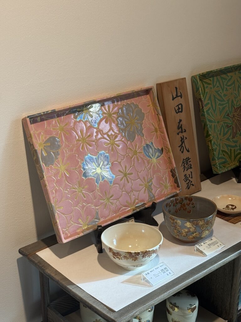 Another field trip that was very memorable was my visit to Tosai 巧芸陶舗 東哉, a ceramic studio located in the Kiyomizu Gojo area of Kyoto. Yamada Yoshio, the current owner of the Tosai workshop, introduced the studio’s ceramic works in the display room to us. All of the ceramics are handmade with fine details by skilled artisans, and the works are all based on traditional Kyoto ware that captures the elegance of Kyoto. We also had the opportunity to visit the painting room within the house, where the pottery and porcelain are painted. The artisans were working on a set of plates devoted to a kabuki commission. Watching them paint was almost meditative because they worked so carefully and slowly, ensuring every detail was perfect.